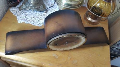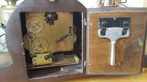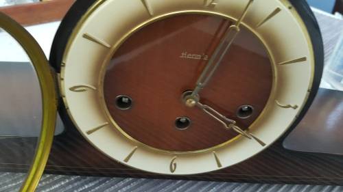 Hermle Art Deco style wind up mantel clock is in perfect working condition, circa 1950s.