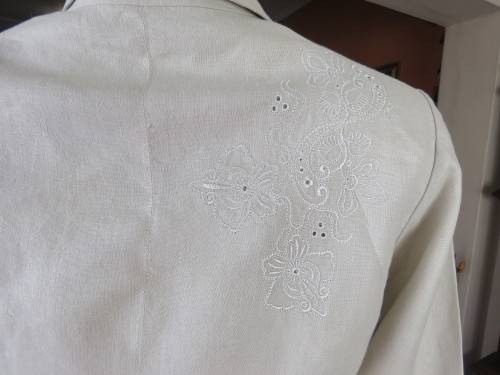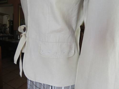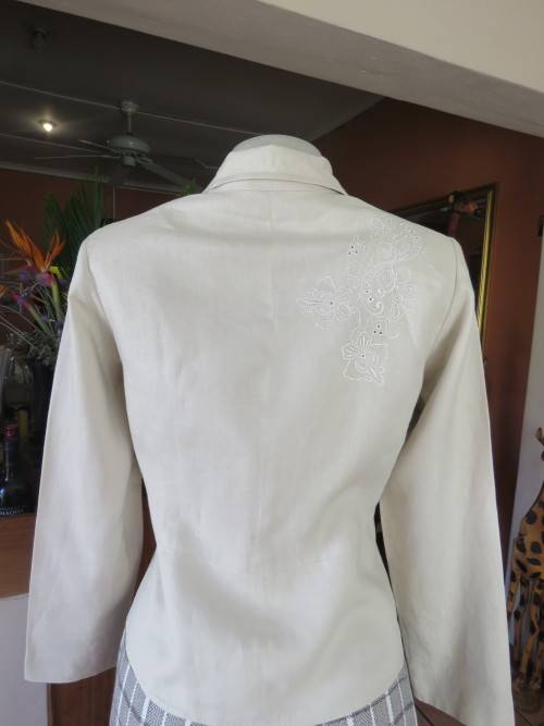 Amazing 100% beige linen jacket in peplum style. Size 37/13 by Yessica. Lining in 100% cotton. Two embroidered dummy pockets on front. Close with hooks and eyes on front as well as two straps to tie . Open collar. Beautiful embroidery on back New condition