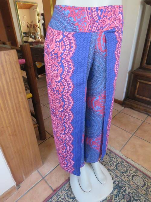 High fashion boho chic pants from Thailand.Legs open,fold over in royal blue with crimson floral design.Back in circle pattern.In cool poly cotton fabric.Size 34/10.Wide waist with elasticated back.New.