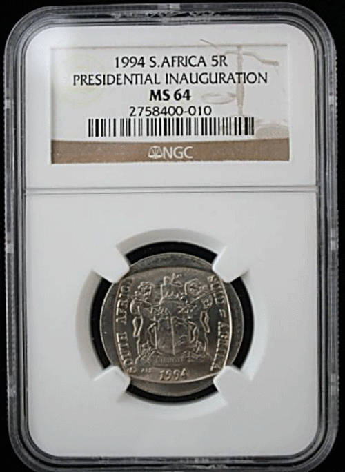 Mandela inauguration MS64 R5 coin. High Grade - Authentic NGC MS64 graded and slabbed.