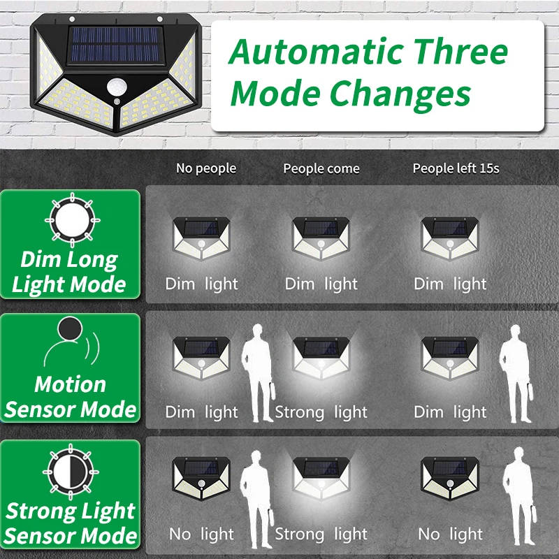 1. Strong light mode: When a person passes by, the solar outdoor lights will light up, but it will turn off when no activity is detected within 20s after the person leaves.