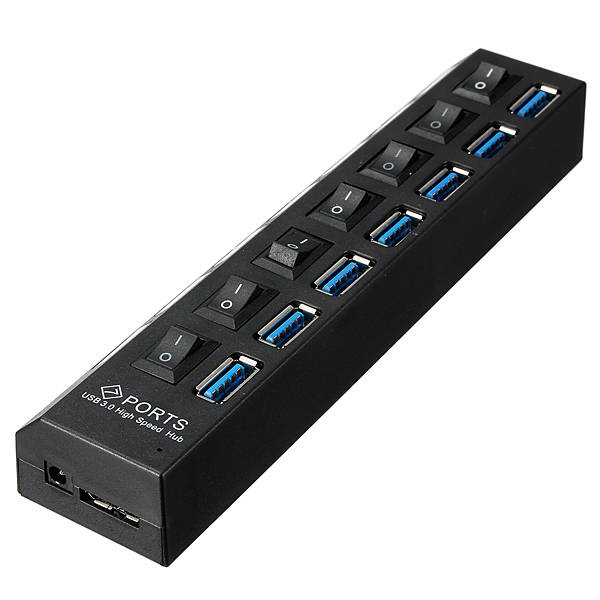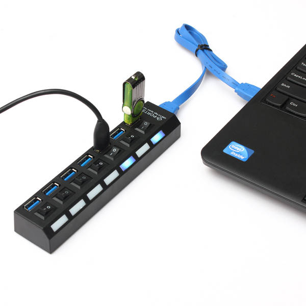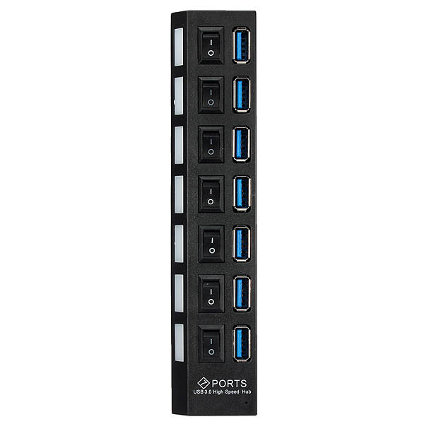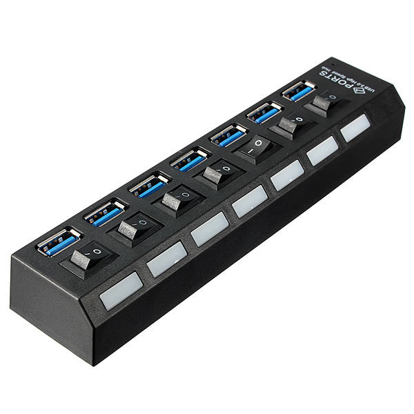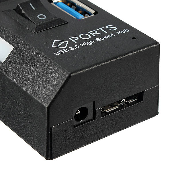 High Speed 7 Ports USB 3.0 External HUB Adapter Suit for Win 7/8 This high-speed USB 3.0 adapter with 7 ports allowing for connection of up to 7 external USB devices for accessing or charging. It does not require any software, drivers, or complicated installation process Features : Plug and play, not need any driver Portable and convenient. Compact USB 3.0 adapter with 7 ports. Backward compatible with USB 2.0/1.1 Built-in LED indicator Ideal if you need extra port to connect additional USB devices, it support multiple devices, including scanners, printers, digital cameras, camcorders, speakers, mice, keyboards, external drives, MP3 players and more! Specifications : Color : Black Dimensions : 16.5 x 3.5 x 2cm(L x W x H) System requirements : Windows XP/Vista/7/8