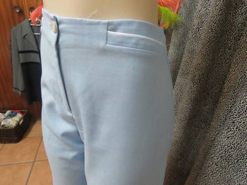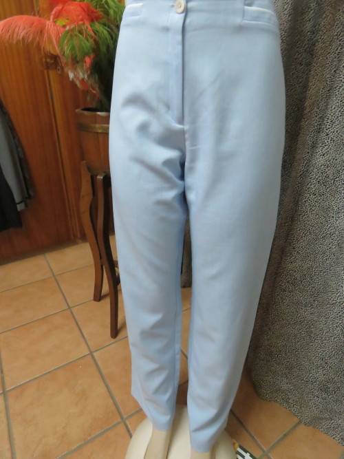 High waist dress pants in light blue with straight legs.Size 36/12.Two dummy pockets on front with white edging.Bandless.Zip on front.In 100% polyester with some stretch.As new.