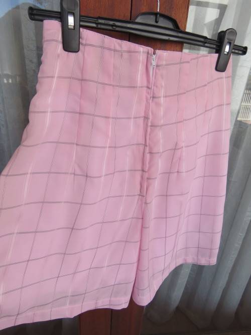 Beautiful Pink Silky Check Shorts in size 6/30 - draped piece on front middle, lined, pleats on front and zip at the back - resembles short skirt, sheer polyester - middle 69cm - smart enough to wear in the evening - new condition.