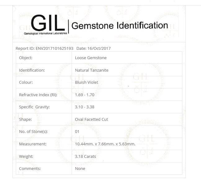 This tanzanite has an identification report by Gemological International Laboratories (GIL) . Gemological International Laboratories (GIL) is an international gemstone testing facility specializing in comprehensive diamond and colored gemstone analysis. The identification report can be verified on the GIL website.