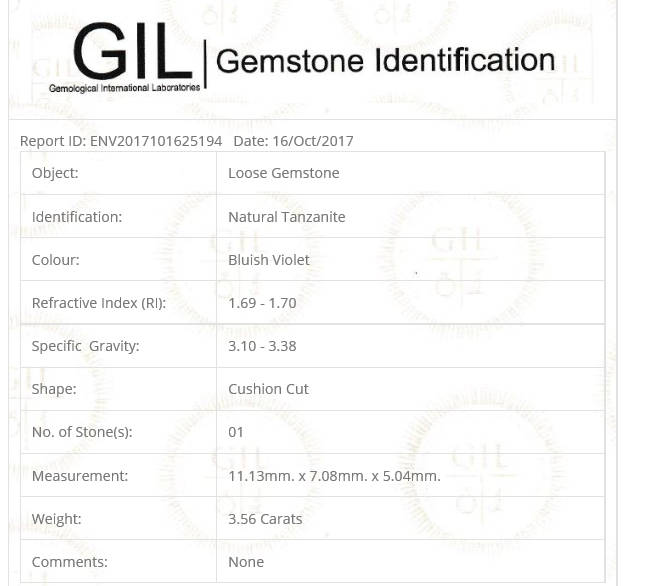This tanzanite has an identification report by Gemological International Laboratories (GIL) . Gemological International Laboratories (GIL) is an international gemstone testing facility specializing in comprehensive diamond and colored gemstone analysis. The identification report can be verified on the GIL website.
