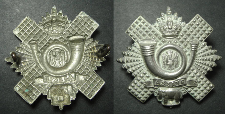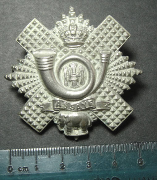According to an internet source, this badge is made of white metal and was worn by the Other Ranks of the Highland Light Infantry. It depicts the star of the Order of the Thistle (a St. Andrew's Cross with rays between the arms), underneath a royal crown. Superimposed on the cross is the regiment's monogram "HLI" within the image of a bugle horn. Below the bugle horn is a scroll that says, "Assaye" and the Highland Light Infantry's mascot, an elephant (both likely commemorate the regiment's actions at the Battle of Assay in 1803). During World War I, Highland Light Infantry battalions fought both on the Western Front and in the Mesopotamian/Iraqi campaign.