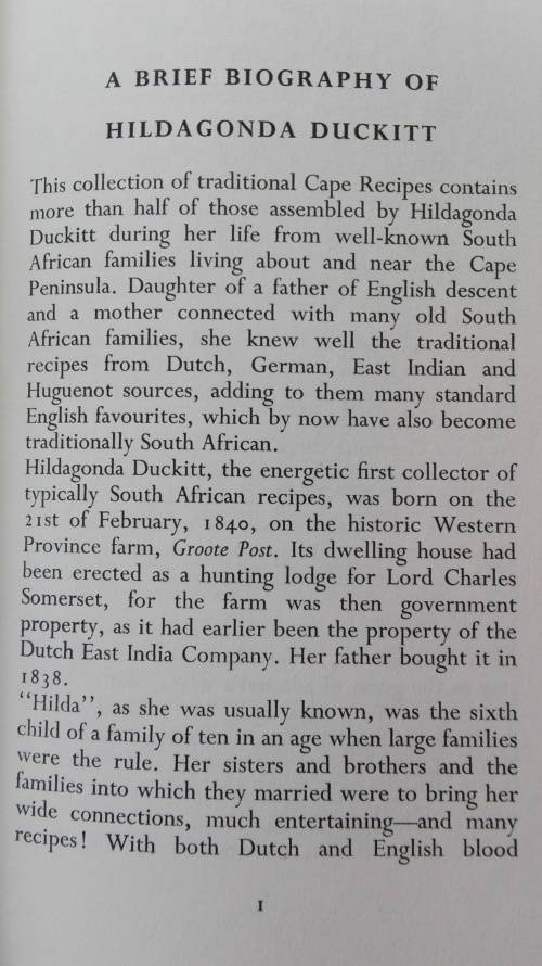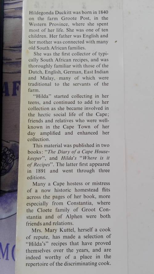 HILDEGONDA DUCKITT'S BOOK OF RECIPES ( Brief Biography and Traditional Recipes ) Hardcover published by A A Balkema -Cape Town 1966 First Edition no of Pages ; 155
