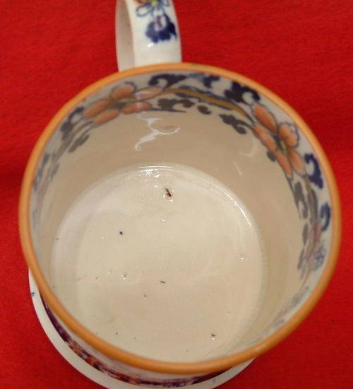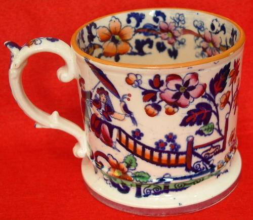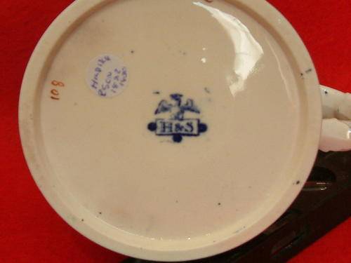 The "Chinoiserie Mug" offered above, stands 9cm tall and just under 9cm wide. It shows a striking, printed pattern in a dark blue with overglazed reds, pink, purple, yellow and green colours. Some gilding is found over the design and a wide band of gilding is seen at the foot of the mug. Manufactured from a translucent porcelain, and showing the rare "H & S' mark on the base, it remains in excellent condition with no chips, cracks or damage to the design. The interior shows a broad band of 'flowers' around the rim, again with some gilding, and some black 'spots' can be seen at the bottom of the mug. These 'black spots' would have been due to coal dust which was caught up during the firing. Coal was used to fire the kilns and coal dust was every potters nightmare. However, these 'spots' are extremely useful for dating unmarked pottery. The glazing is fairly thick, and has an 'orange peel' effect, glazing was still in its infancy during the early 1800's. Some trapped air bubbles in the glaze are also evident on the base.