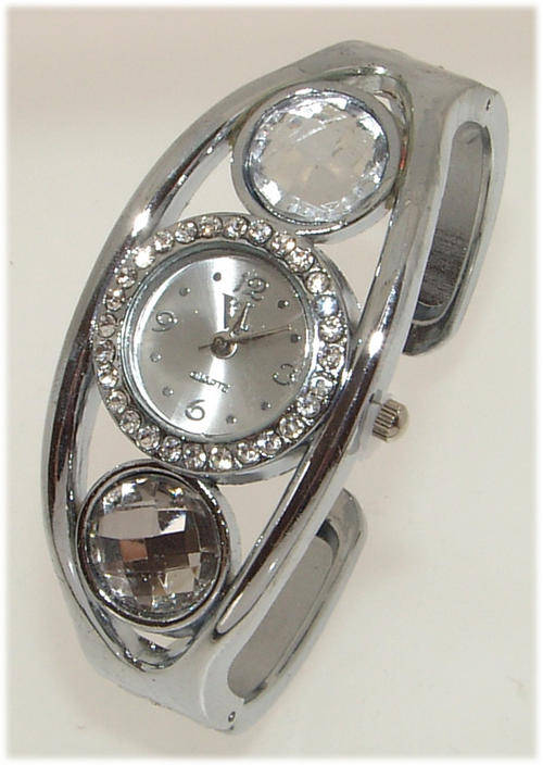 WHITE METALLIC FACE SILVER BEZEL SURROUNDED BY WHITE RHINESTONES SILVER HANDS AND MARKERS HINGED BAND WITH BIG BLING LUCITE BEADS WILL FIT SMALL TO MEDIUM WRISTS STAINLESS STEEL BACK