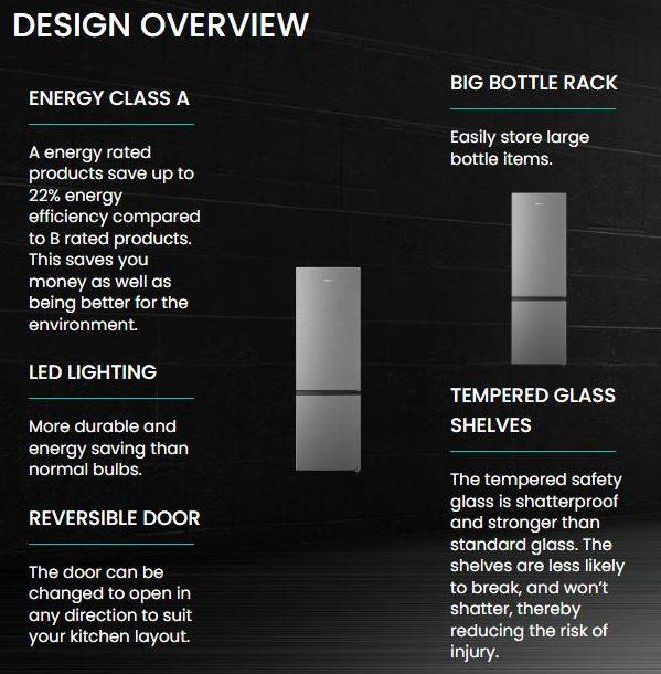 The Hisense 222 Litre Capacity Freestanding Fridge and Freezer with Water Dispenser Combination is a great addition to your kitchen and packed with a great capacity your family needs for storing chilled and frozen treats. The combined capacity of 222 litres which is 159 Litre Fridge and 63 Litre Freezer is plenty room stock up on supermarket deals or batch cooking meals to use later on, Plus it has a 2 litre water tank and water dispenser for refreshing cold water. It comes with removable tempered glass shelves, so you can make room for food of all shapes and sizes. To top it off, the shelves are also spill-proof, making light work of cleaning spillages should they occur. You'll also find three door balconies in the fridge, giving you plenty of options for milk, cheese, and condiments. To store your healthy fruit and veg, there's a roomy salad bin and a full-length rack to store up to four bottles of your favourite drinks.The freezer compartment contains three clear drawers, for the convenient organisation of your frozen goods. The net capacity is 63 litres, which is ideal for storing leftovers or your favourite ice cream as well as fish and meat. What's more, reversible door hinges on this appliance mean the door can be adjusted to opened on whichever side you prefer.