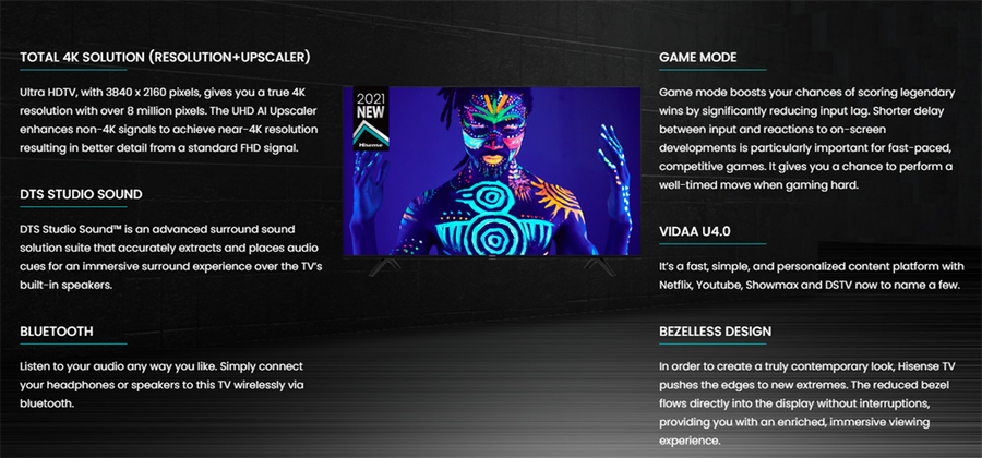 Total 4K Solution (Resolution + Upscaler) DTS Studio Sound Bluetooth Game Mode VIDAA U4.0 Bezelless Design