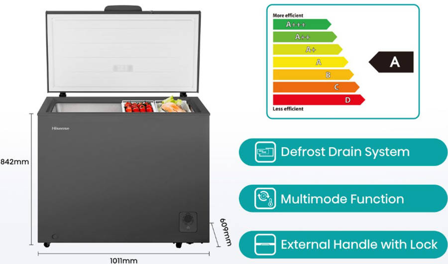Hisense Metallic Silver Chest Freezer - 245L Net Capacity, a energy rating, soft closing door, fast freeze function, aluminum interior, external handle with lock, defrost drain system, low noise 41dB, 4 star freezer, 360 degree Cooling, high insulation door seal, and 1 year warranty
