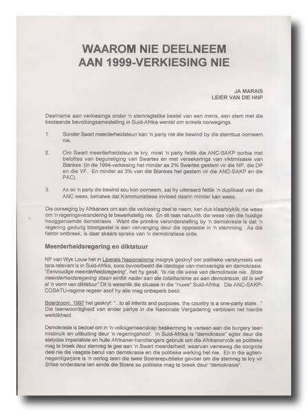 HNP: Waarom nie deelneem aan 1999-verkiesing nie deur mnr Jaap Marais. A4, "staple"-boek, 16 bls. Effens verweer en paar kreukels... alles goed leesbaar.