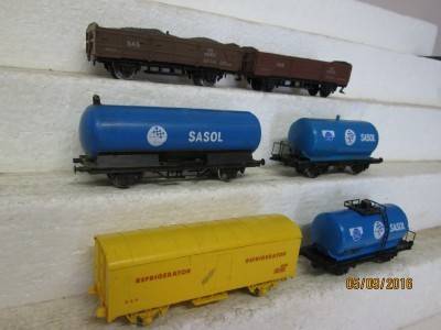 5 OF THE 6 WAGONS HAVE METAL WHEELS, BUT ALL THEIR COUPLINGS ARE MISSING.