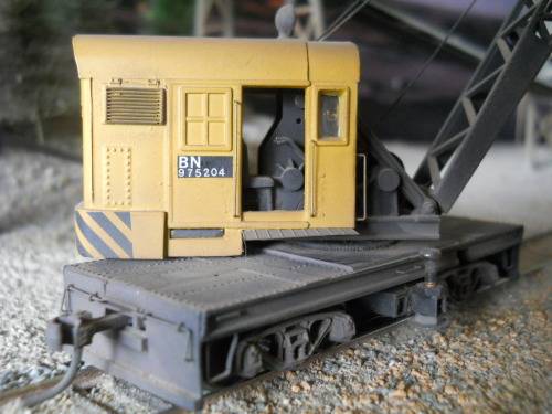 BURLINGTON NORTHERN MAINTENANCE OF WAY OHIO CRANE WITH CLAMSHELL BUCKET.CLAMSHELL HINGE IS DAMAGED ON ONE SIDE.SOME DETAIL ADDED AND BOTH WINCHES ARE WORKABLE TO POSITION AS DESIRED.