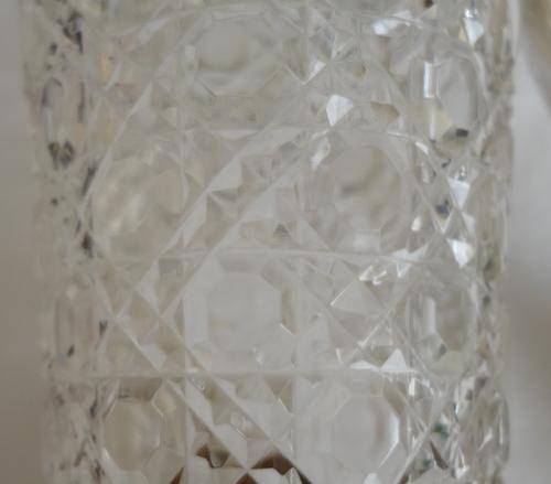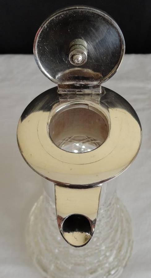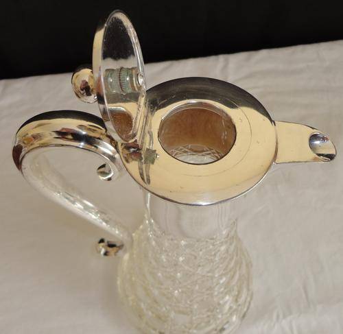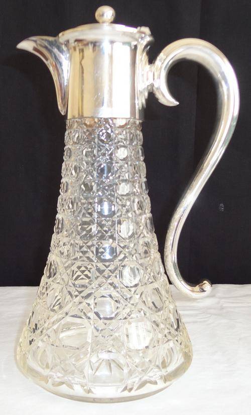 On offer is this beautiful Hobnail Cut crystal and E.P.N.S claret jug . It is in very good condition with no chips , cracks or wear to the plating .It is not cloudy or stained . It appears to date from the 1920's or 1930's . I can't find a makers mark on the metal mounts . It is a very striking piece .