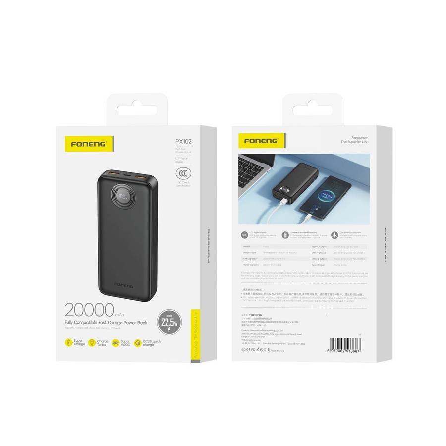 -The Hoco J107 Super Power Bank is a powerhouse with a massive 90,000mAh capacity and a powerful 22.5W output. With 5 output ports, this versatile charging solution is perfect for keeping all your devices fully charged and ready for use.-The Hoco J107 Super Power Bank charges up to 50% in just 30 minutes, making it an ideal companion for those constantly on the move. Its LED digital display allows you to monitor the remaining power at a glance, while the built-in LED table lamp provides added convenience.-Invest in the Hoco J107 Super Power Bank for a reliable and efficient charging solution for all your electronic devices. Its impressive features and powerful performance make it an essential accessory for your daily life.Features-Capacity: 90000mAh 333Wh-Rated capacity: 50000mAh-Input: Type-C/Micro USB/8 Pin: 18W-Output: Type-C: 20W (PD/QC/AFC/FCP), USB 1: 22.5W (QC/AFC/FCP/SCP), USB 2/3/4: 5V/2.1A-Total output: 5V/3A-Display: LED digital display power-Material: ABS+PC flame retardant material+lithium polymer batterySupports fast charging technologies such as PD 2.0, PD 3.0, QC 2.0, QC 3.0, Huawei FCP/SCP, Samsung AFC, and othersCompatible with Super Fast ChargeIntelligent Balance Technology5 outputs: 4x USB + Type-CLED table lampWhat's in the box1x Power Bank