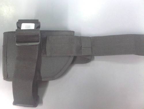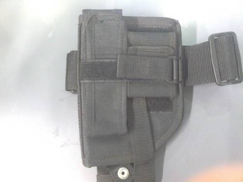Has elastic/velcro thigh strap with 2 spare Co2 cylinder pockets and a pocket for a spare tube of ammo.