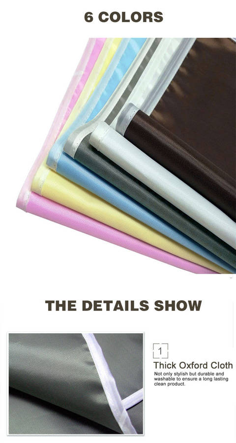 Colors : Dark Grey,Coffee,Pink,Bule,Yellow,White Hook : Stainless Steel Hook, Sucker Hook Size : 76 x 51 x 5cm Material : Oxford Cloth Weight : 200g