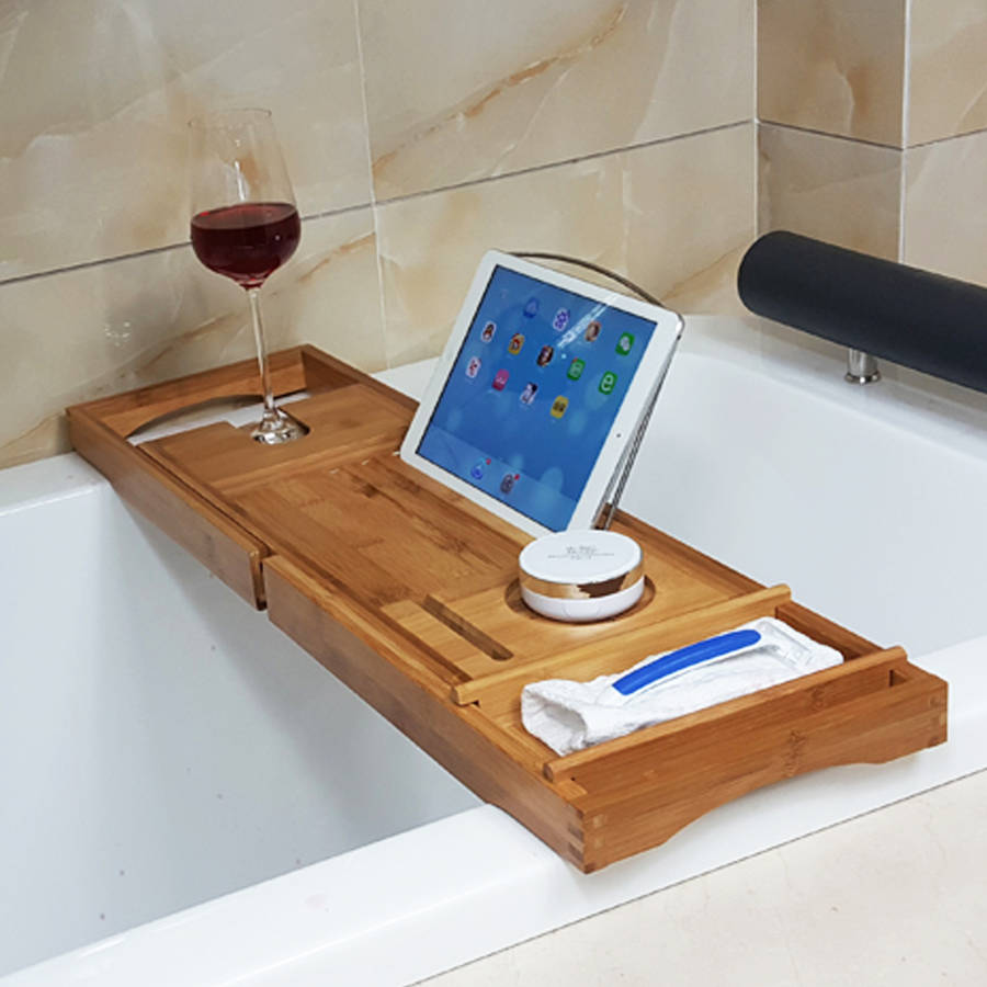 Honana BX-816 Expandable Bamboo Bath Caddy Wine Glass Holder Tray Over Bathtub Rack Support Storage