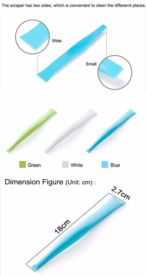 Description: Removing the kitchen's stain easily, and won't scratch its surface. The scraper has two side, a wide one and a small one.You can clean the dirt of the corner. Being made of PC material, nontoxic, no peculiar smell and very durable. Specification: Color : Green, Blue, White Material : PC Weight : 20g Size : 18*2.7*1cm / 7.1*1.1*0.4in (L*W*H) Package Include: 1 * Mutifuntion Scraper Details Pictures: