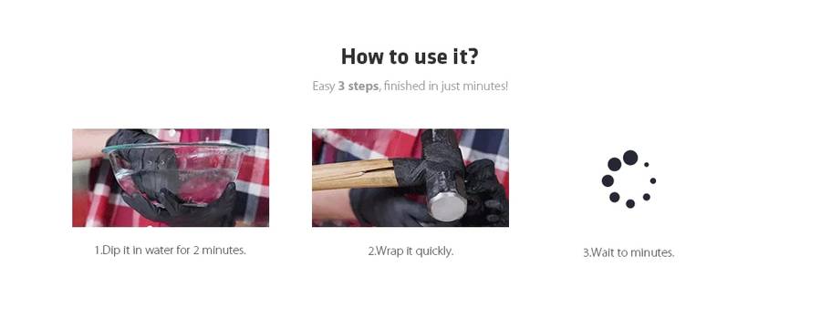 Product function description: Bring the gloves, cut the vacuum packaging bag, take out the product into the pre-filled water container, the water temperature is preferably 2-10 degrees; soak for 1 minute, take out the product, squeeze out the excess water, entangle in Where it needs to be repaired, tighten it slightly to make the product tightly fixed with the area to be repaired. Wait 5-15 minutes. Ready to use.