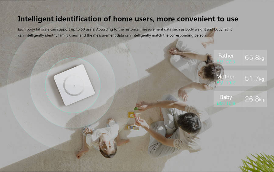 Intelligent identification of home users, more convenient to use Each body fat scale can support up to 50 users. According to the historical measurement data such as body weight and body fat, it can intelligently identify family users, and the measurement data can intelligently match the corresponding person.