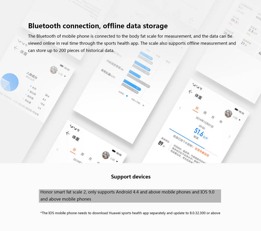 Support devices Honor smart fat scale 2, only supports Android 4.4 and above mobile phones and IOS 9.0 and above mobile phones *The IOS mobile phone needs to download Huawei sports health app separately and update to 8.0.32.300 or above