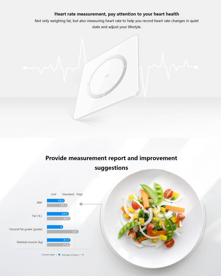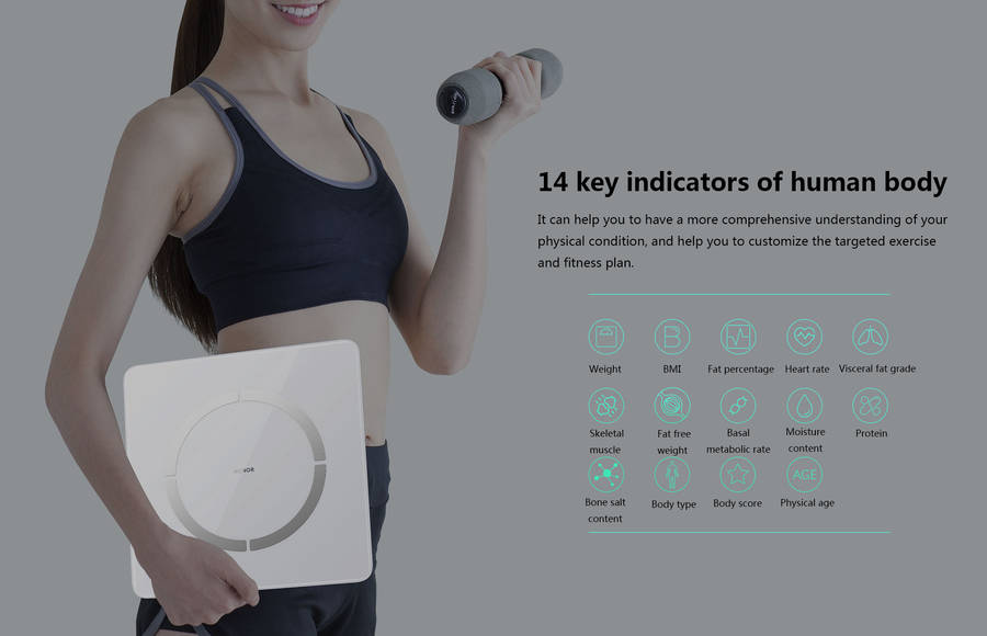 14 key indicators of human body It can help you to have a more comprehensive understanding of your physical condition, and help you to customize the targeted exercise and fitness plan. Weight, BMI, Fat percentage, Heart rate, Visceral fat grade,Skeletal muscle content,Fat free weight,Basal metabolic rate,Moisture content, Protein,physical age,Body score,Body type,Bone salt content