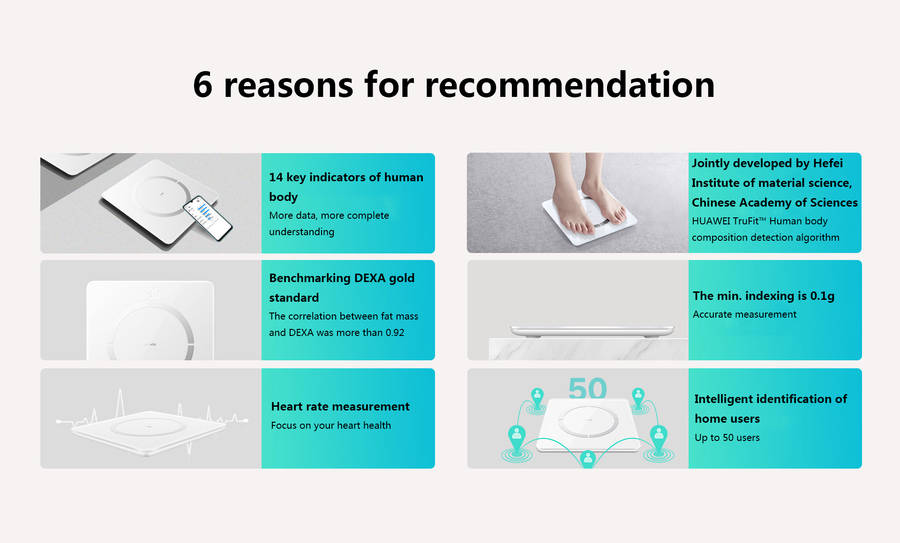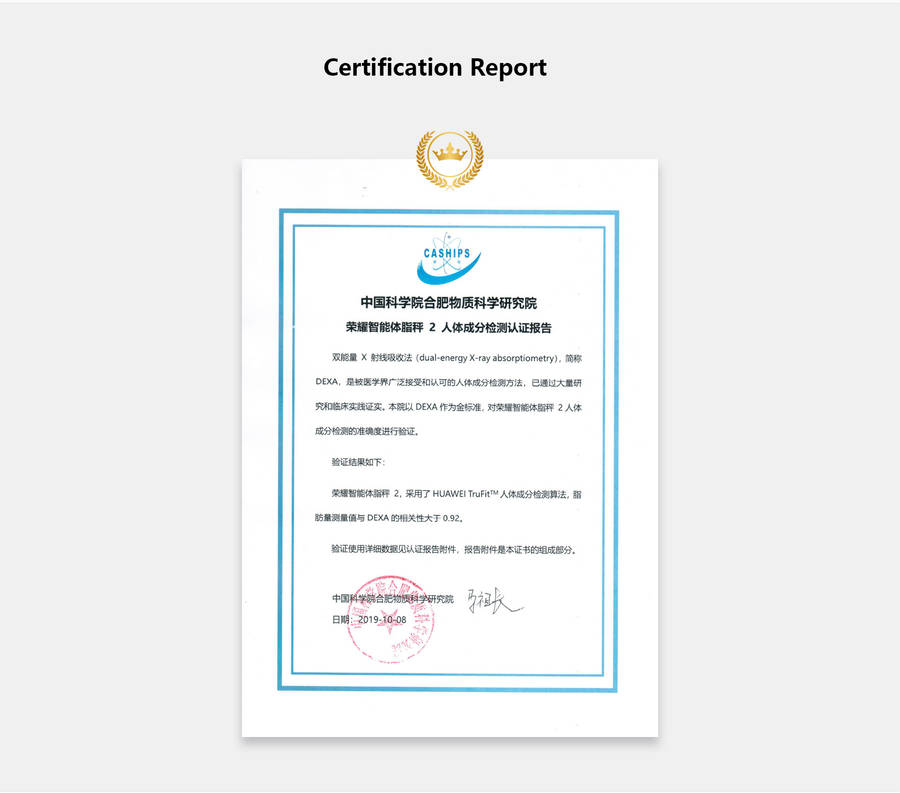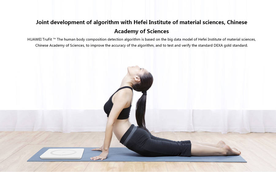 Joint development of algorithm with Hefei Institute of material sciences, Chinese Academy of Sciences HUAWEI TruFit a The human body composition detection algorithm is based on the big data model of Hefei Institute of material sciences, Chinese Academy of Sciences, to improve the accuracy of the algorithm, and to test and verify the standard DEXA gold standard.