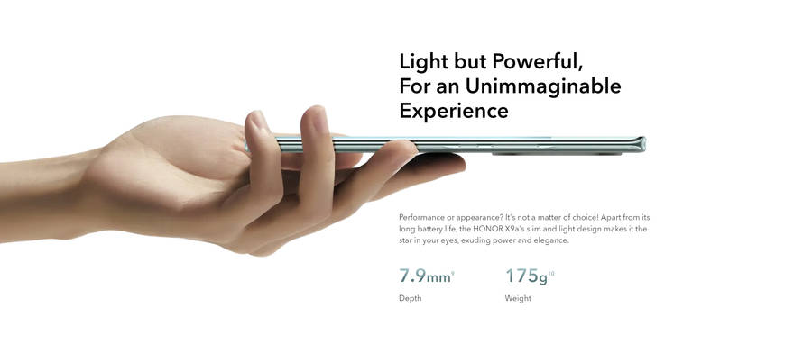 The Honor X9A features a 0.65mm deeply reinforced glass with enhanced stress of over 900Mpa for its anti-drop curved screen. Rigorous laboratory tests have proven its durability, making it capable of withstanding everyday bumps and drops.