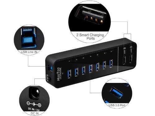 OverviewDo you want to FAST charge your smartphones/tablets at the same time when all other USB ports are doing QUICK data transferring and they will not influence each other because of power limitation? HooToo HT-UH010 7 port USB 3.0 hub makes this come true. Two exclusive smart charging ports will automatically adjust output currents for smartphones/tablets; keeping multiple gadgets powered up better than ever.SpecificationUSB Port Type: 7 USB 3.0 ports + 2 samrt charging portsMaterial: rubber oilSize: L*W*H: 5.71*1.73*0.91 inchesCompatible Charging DevicesAll Apple devices: iPhone 5S/5C/5/4/4S; iPad mini; iPad 4/3/2All Android devices: Samsung Galaxy S4; S3; HTC Sensation; EVO; One X; Samsung Galaxy NoteTablets: Samsung Galaxy TabletsData TransferSpeed: Usually 10 times faster than USB 2.0. Average speed at around 100 to 120 MB/sCompatibility: USB 3.0 interface. Backward compatible with USB 2.0/1.1Support devices: Most USB devices: printer; mouse; keyboard; card reader; camera; hard drives dock and so onOperation SystemsWindows 98/Me/2000/XP/Vista/7/8. Mac OS X or above. Linux 3.0 or aboveRemarks- Some USB 3.0 devices require a direct connection to host USB 3.0/2.0 ports; including some USB 3.0 hard disks; 2.4GHz wireless devices- Charging ports do NOT support data transfer and USB 3.0 ports do NOT support chargingPackage1*7+2 port USB 3.0 hub;1*USB data cable (3.3ft);1*12V/5A Power Adapter (11ft);1*User manual