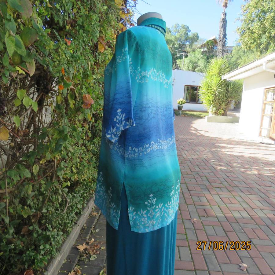 Horizontal patterned short sleeve summer top in teal green and blue with tiny white flowers. Button down with open collar. Slits at sides. Label cut off. In 100% polyester. Size 38-14. As new condition.