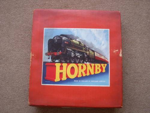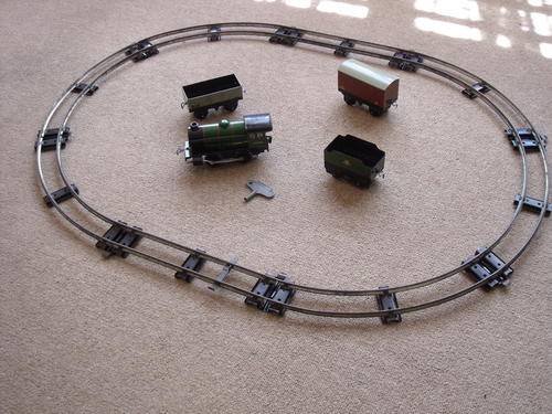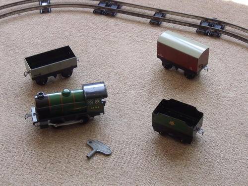 Hornby train goods set no. 30 , made in England , 0 - guage , clockwork (working) , engine has forward and reverse and can be stopped automatically on the track , there is one tender , one open wagon and one closed wagon , in original box.