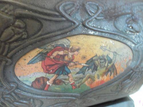 DETAIL ON ONE SIDE EMBOSSED ON TIN THE INSIDE IS IN ONE PIECE BUT RUSTY