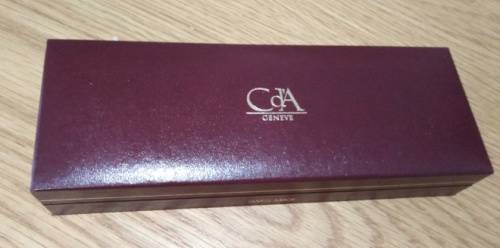 The Caran d’Ache case is lined with maroon satin in the lid and the mould in which the pen rest is covered in red velvet. The case is decorated with a thin gold line and the logo is printed in gold at the top. The case is in good condition and a leaflet is included.
