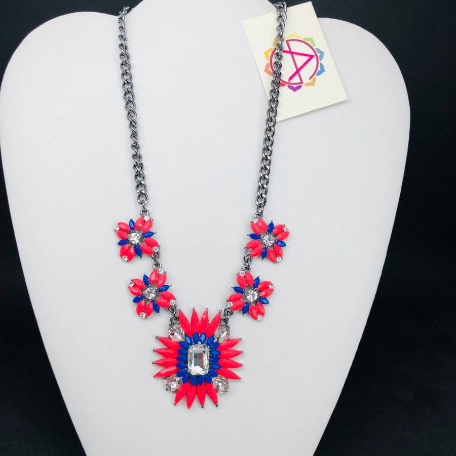 Two tone gunmetal brass necklace with Austrian crystals and resin stones. Measurements: Length 16"-18" x Width 2"