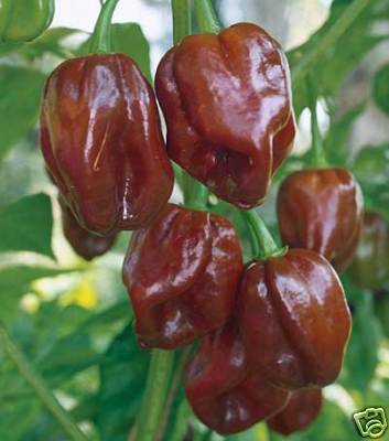 Matures from green to chocolate brown color. So beautiful, yet so deadly. don’t let the color fool you; these are not candy, but rather flaming-hot fruit that carry a massive 300,000 Scoville units of heat! Hot pepper enthusiasts love the heat and flavor that these chocolate fruit are packed with, but be careful and use in moderation.