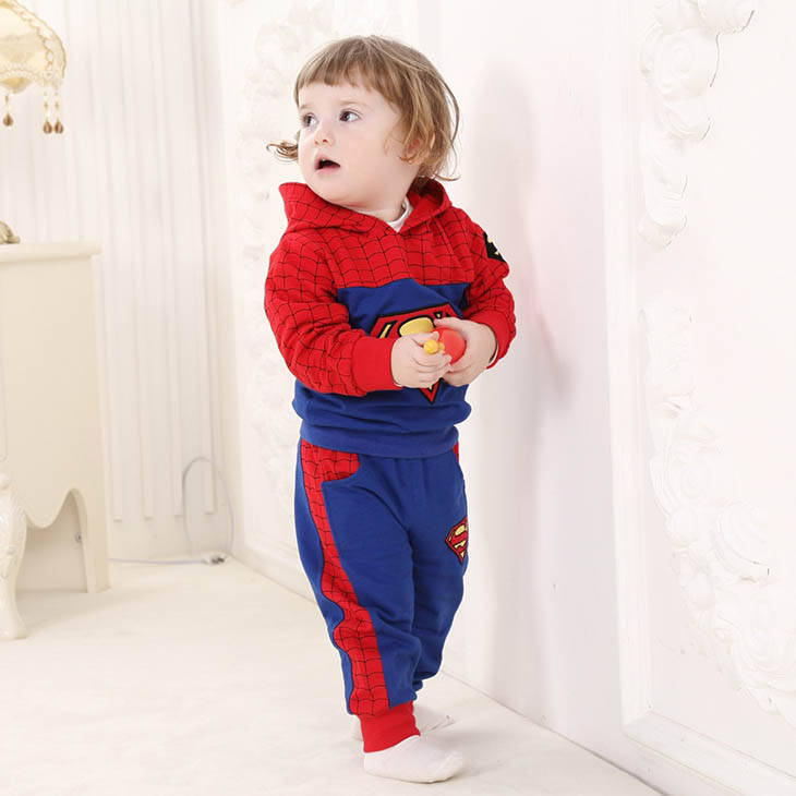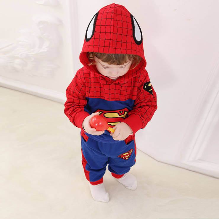 Hot sale baby kid costume features: a royal blue and red cotton fabric, with superman logo in front, spiderman style design long sleeves hooded jacket, matching trousers.