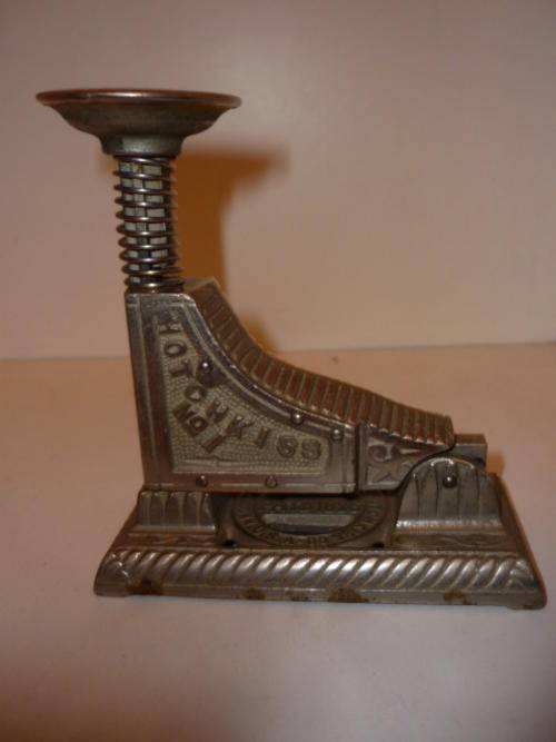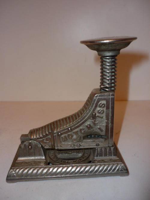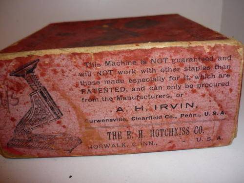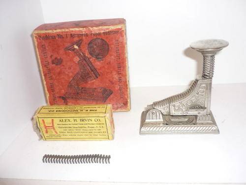 The Hotchkiss No. 1 Automatic Paper Fastener uses a single strip, on which there are 25 staples. These staples when inserted into the machine are automatically cut off and fed forward, accurately and without failure. The staple is always ready to be driven and a single blow will suffice to drive it through 1 to 25 sheets of paper, and with the same movement, feed forward the next staple. After the strip is used up, it is very easy to place another strip in the machine. These fasteners are not only useful for fastening papers, but for fastening samples of goods, such as silks, laces, lines, dress goods, etc., presenting a neat appearance - in fact neater than any other method of stapling.