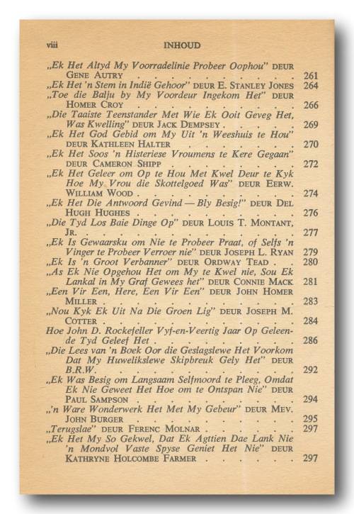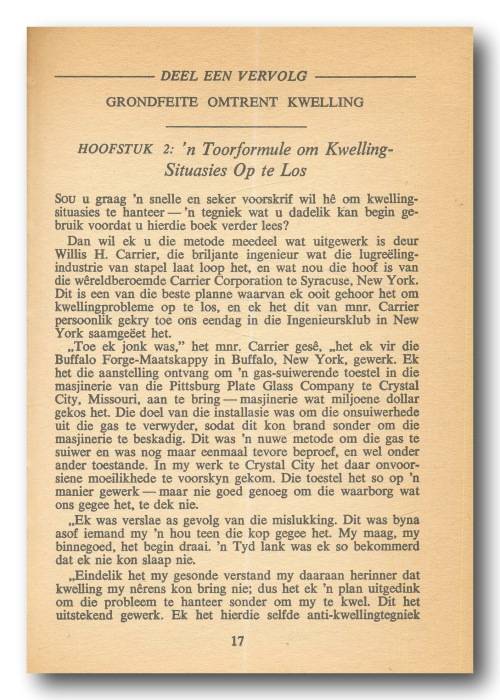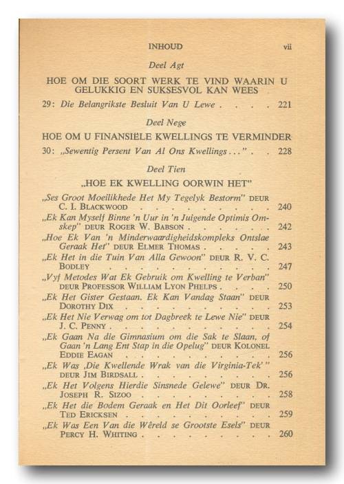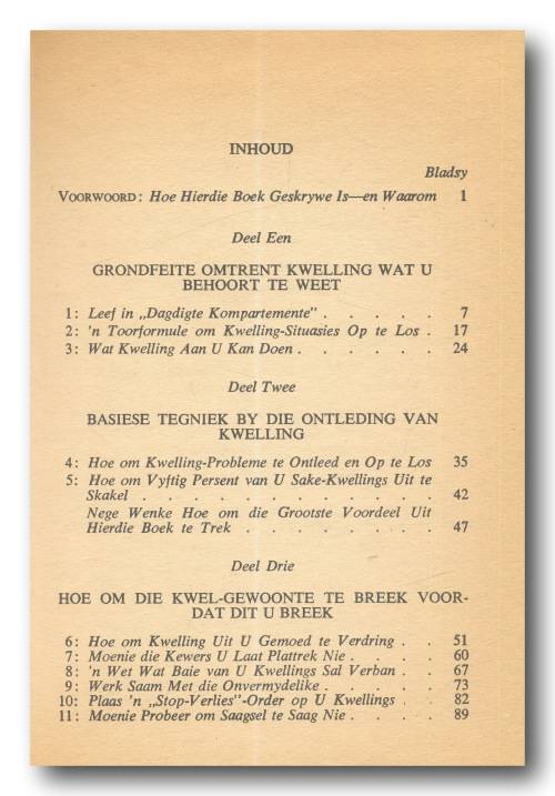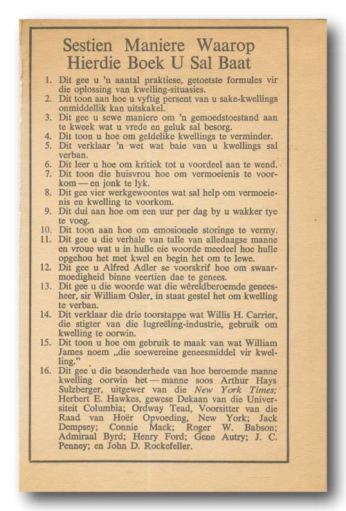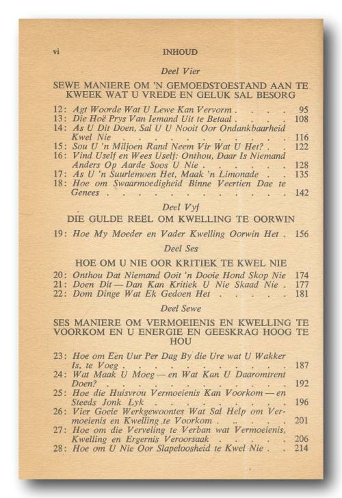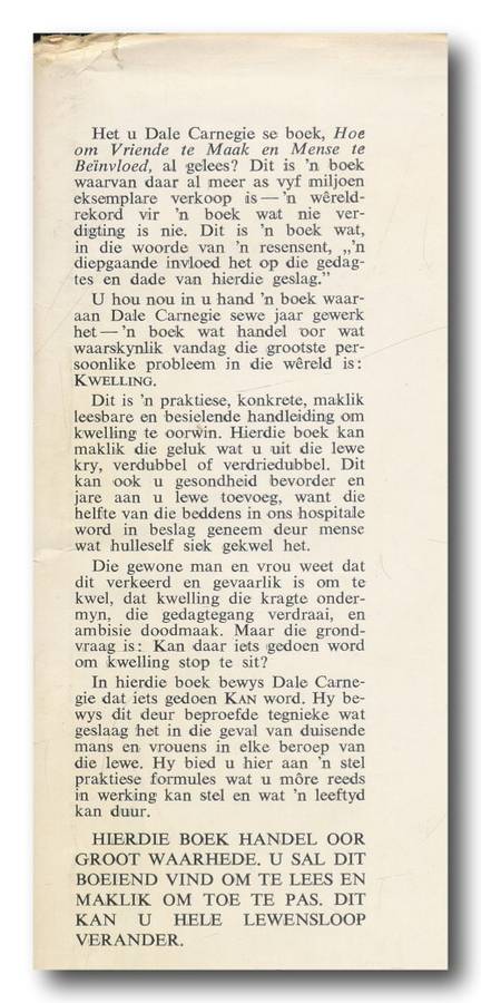 Hou op kwel en begin lewe deur Dale Carnegie in Afrikaans deur Timo Kriel (6e druk 1971). A5, hardeband met stofomslag, 299 bls. Stofomslag redelik verweer. Boek binne in goeie toestand. Sommige bladsye het rooi pen-onderstreping. Als goed leesbaar. Bladsye het vergeel.