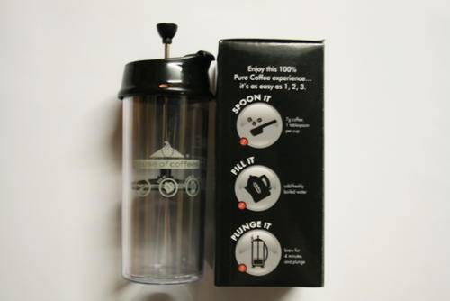 • 16-ounce travel coffee press with House of Coffees printed on side