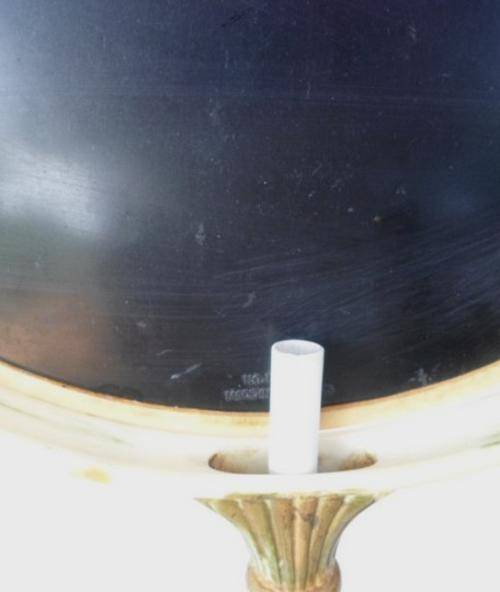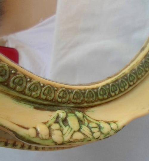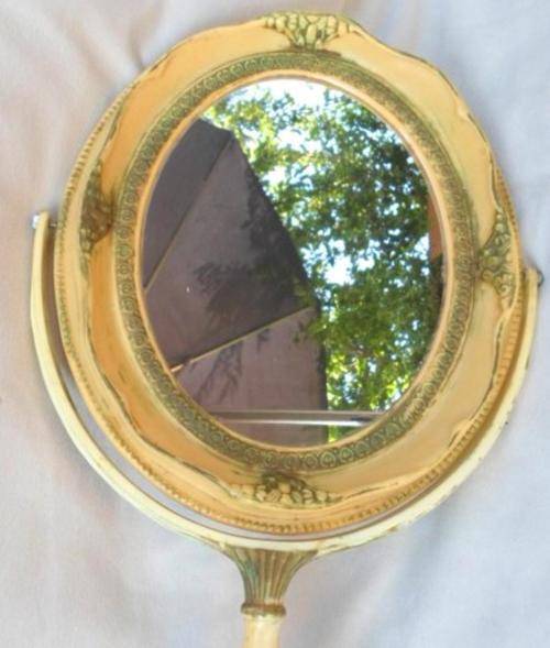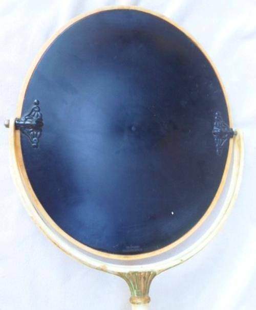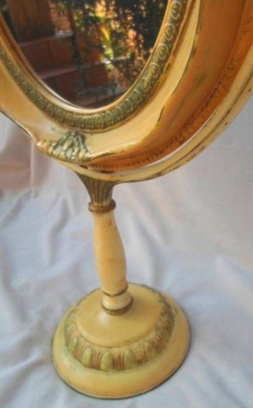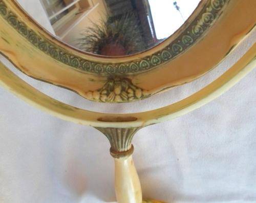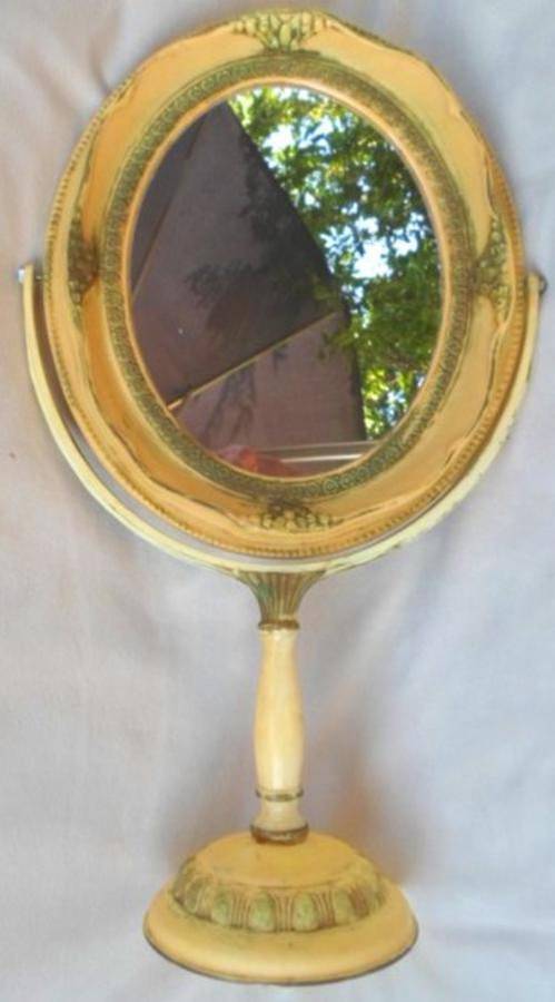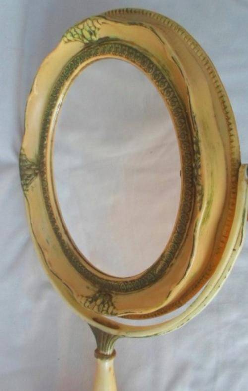 52CM TALL WITH MIRROR PORTION MEASURING 32CM X 28CM - A VERY OLD AND RARE MIRROR ON STAND MADE FROM EITHER BAKELITE OR BANDALASTA OR SOMETHING LIKE THAT - I CANNOT FIND ANOTHER LIKE IT!! IT IS OLD AND THERE ARE MARKS AND PAINT LOSS BUT HOW TOTALLY UNIQUE AND CHARMING! MARKED 'MADE IN HONG KONG' ON BACK OF MIRROR. WILL NEED CAREFUL PACKING SO SHIPPING WILL BE R75.