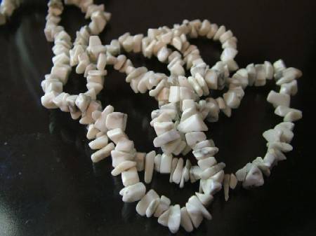 Stone type Natural Howlite white Size Varies - avg 5mm to 8mm Length 900mm Type Chips / beads - drilled right through Colour White with pale grey banding (as per image) Sources USA Quantity 1 strand at a time Picture Actual photo of strand from supplier