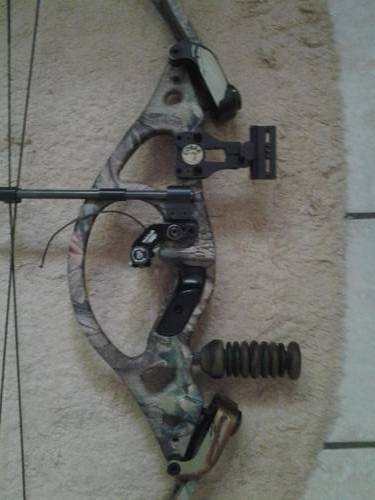 Hoyt Reflex Excursion Camo Hunting Bow with Camo design, Camo design Stabilizer, Cobra Sight, Quicktune drop, Brand new string, 60 - 70 pound draw weight, 27 - 30 inch draw length. With a few arrows.