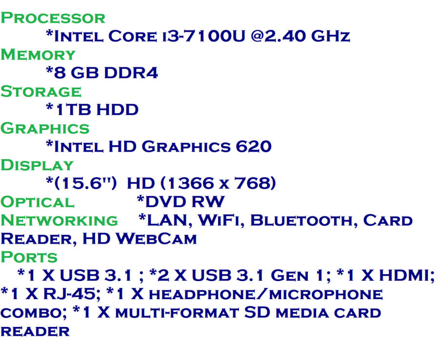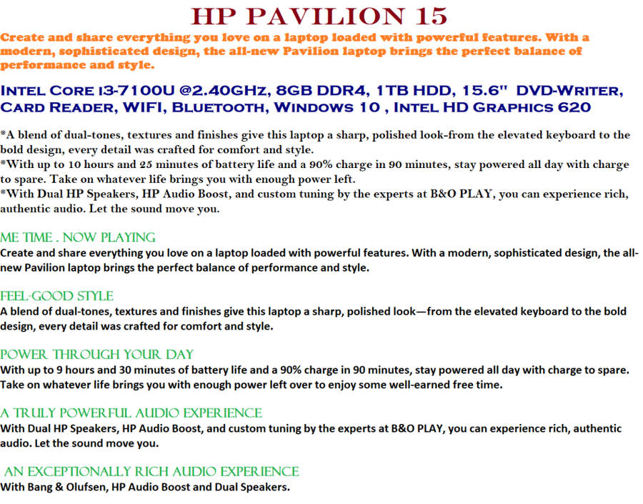 HP PAVILION 15 , 7TH GENERATION INTEL CORE I3-7100U @2.40GHz,8GB RAM ,1TB HDD, INTEL HD GRAPHICS