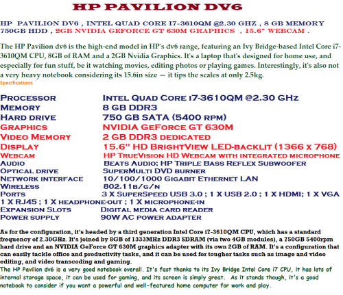 HP PAVILION DV6 , QUAD CORE I7-3610QM @2.30GHz, 8GB RAM, 750GB HDD ,2GB NVIDIA GEFORCE 650M , WEBCAM