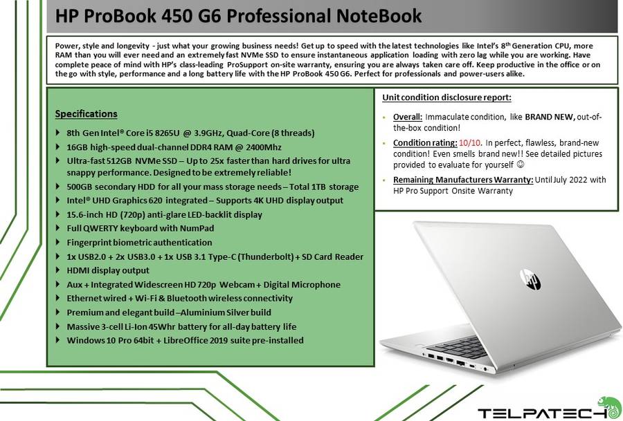 HP ProBook 450 G6 Professional NoteBook - **8th Gen Core i5, 16GB RAM, NVMe SSD + HDD dual drives**