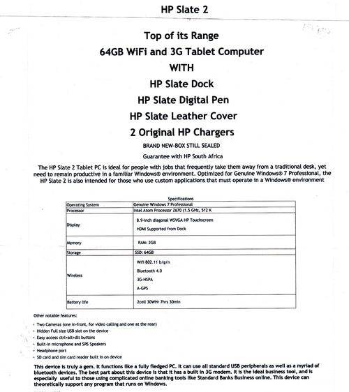 HP SLATE 2 (AS NEW STILL IN PACKAGING) WINDOWS 7 .+64 G+.3G. +2 CAMERAS PLUS PLUS PLUS !!